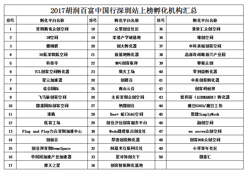 那么,这些孵化机构怎样?实力如何?谁的贡献能力更大些?日前,由36计、胡润百富、华润置地润商务联合主办的胡润百富中国行深圳站暨粤港澳大湾区全球价值链高峰论坛,在深圳前海华侨城JW万豪酒店隆重举行,会上,胡润现场发布两大榜单——《2017胡润百富中国最具贡献孵化机构百强榜深圳50强》。