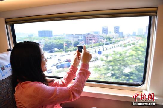 9月29日,由“复兴号”动车组担当的G9731/2次列车穿行在广州南与深圳北站之间,由此拉开“复兴号”动车组在广深港高铁运行的序幕。“复兴号”车厢内座位旁设有电源插座以及USB口,并实现整列车厢WIFI全覆盖等。图为列车旅客拿手机拍摄窗外景色。