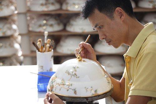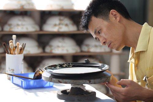 当年,日本老师傅就很喜欢李勇,因为小伙子脑袋灵光。不仅技术的东西一教就会,会猜老师心里所想,还懂得举一反三。这回为 " 夫人瓷 · 石榴家园 " 一个器碟的波浪边描金,人家在抱怨太难,只有李勇不吭不声,利用废弃材料,做了支改良的描金笔,一下就让合格率和效率上去了。