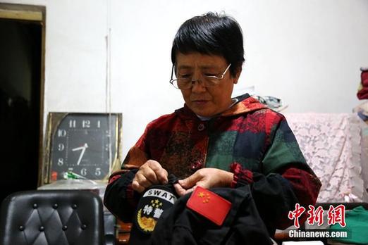 高平市公安局特巡警大队教导员宋建峰的母亲。天气逐渐变凉了,老母亲把厚警服拿了出来紧着扣子,等着儿子回家来取。 王冠楠摄