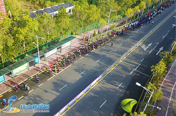 一路彩旗飘扬,各长跑队伍高举旗帜,向终点跑去。