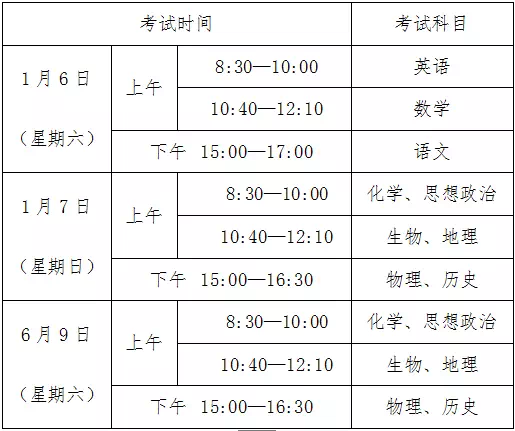 记者了解到,2018年1月考试科目为语文、数学、英语、思想政治、历史、地理、物理、化学和生物等9科,6月考试科目为思想政治、历史、地理、物理、化学和生物等6科。除语文科考试时长为120分钟外,其余各科考试时长均为90分钟。1月考试成绩在2月下旬公布,6月考试成绩在7月上旬公布。
