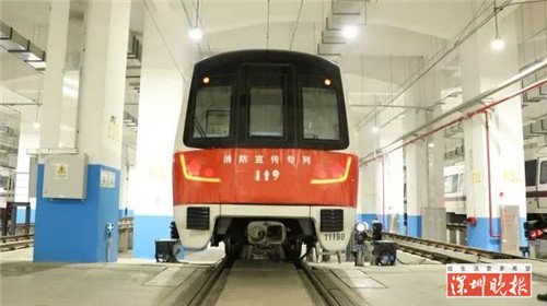 11月9日上午,地铁11号线深圳消防红色专列惊艳亮相。消防专列主体色调采用中国红和消防橙,搭配抢眼,车厢内绘制着消防小知识、消防谜语、消防故事及消防顺口溜等内容,既有颜值又有料。