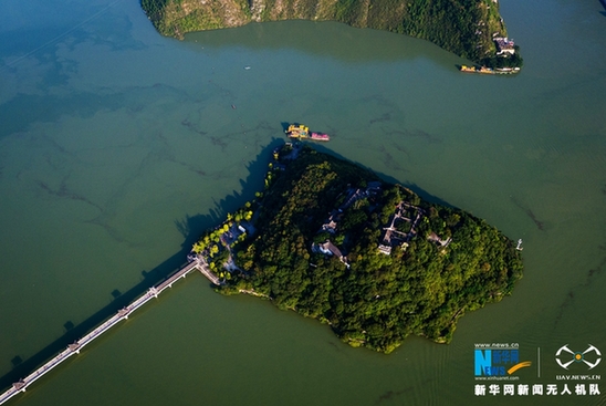 图为今年11月初航拍的蓄水175米的瞿塘峡,白帝城四周江水环绕,城内森林茂盛,城墙掩映在苍翠的树林间。