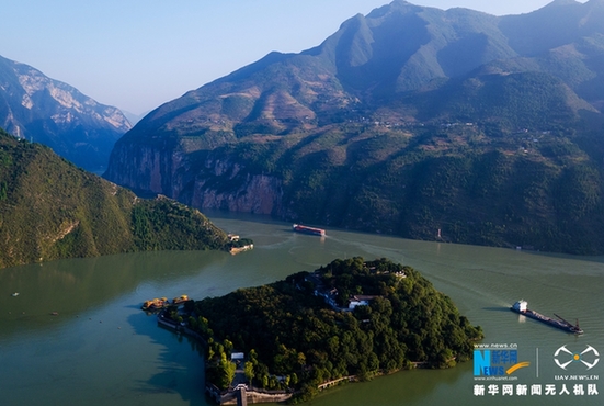 图为今年11月初航拍的蓄水175米的瞿塘峡,白帝城四周江水环绕,城内森林茂盛,城墙掩映在苍翠的树林间。