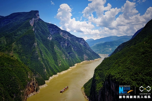 图为今年7月航拍的瞿塘峡,由于暴雨泄洪等原因,江水呈现黄色。从两岸绝壁上可以看到水位下降的痕迹。