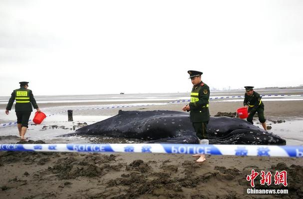 11月13日中午12时许,一头座头鲸搁浅启东海滩,当地边防派出所官兵闻讯立即前往现场营救,经过各方努力,当日下午5时30分,鲸鱼成功脱困,游回大海。