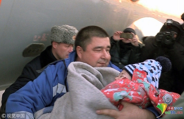 当地时间2017年11月16日,俄罗斯哈巴罗夫斯克,3岁女童扎丝米娜(Zhasmina Leontyeva)被安全接回。11月15日,一架小型客机在俄罗斯远东哈巴罗夫斯克边疆区坠毁,机上7人中的6人遇难,而一名3岁的女童奇迹生还。