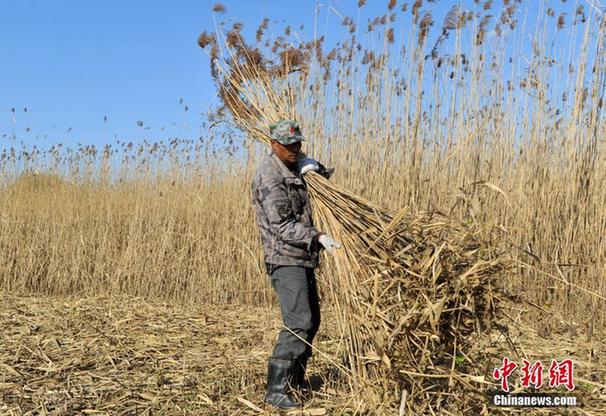 11月22日,在“华北明珠”白洋淀芦苇荡里,白洋淀水区附近的居民正在把芦苇捆成一捆捆,然后用木船载回家。据了解,白洋淀边的人们把收芦苇叫“打苇”,“打苇”的时候大约是在立冬前后,等水面结冰没有办法通船了就不再“打苇”了。