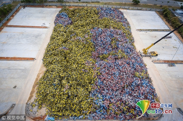 2017年11月19日,厦门,在厦门市运动训练中心西面的一块空地上,大量共享单车堆积如山。