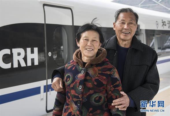 从未坐过任何火车、家住秦岭腹地的陕西省佛坪县东岳殿村六组73岁的叶明吉和妻子专门赶到佛坪高铁站,与模拟运行的CRH3A型动车组列车合影留念(11月25日摄)。 “蜀道之难,难于上青天!”1200年前,唐朝大诗人李白置身雄奇险峻的秦巴大山,写下千古绝唱《蜀道难》。而今,我国第一条穿越秦岭的西成高铁通车在即,“蜀道难”将成为历史。秦蜀之间的道路素以艰险著称,据史料记载中国古代连接陕西和四川这两大地区的只有蜿蜒在秦巴山区中的子午、傥骆、褒斜、金牛等七条古道。从秦汉时的古栈道到2007年9月西安至成都高速公路的全线开通,跨越了2000多年;而从高速公路到高速铁路的开通,仅仅用了10年。蜀道的演进,是一个又一个奇迹的创造。 “西成高铁秦岭段总长度为135公里,其中隧道就占到127公里。途经的陕西段长度为343.6公里,而桥梁和隧道总长更是达到321公里,占线路总长的93%。”西成高铁陕西公司西成指挥部副指挥长赵定江说,这条高铁建设过程中深挖隧、架大桥,为世所罕见。西成高铁全长643公里,设计时速为250公里。开通后,成都与西安两地铁路旅程将由目前约16小时缩短到3小时左右。特别是秦巴山腹地的陕西省汉中市,到西安由4个小时缩短成1小时、到成都6小时缩短到2小时。人们中午在西安吃羊肉泡馍,傍晚可以在成都休闲逛街。昔日“蜀道难”阻挡了秦巴地区的经济发展和百姓们的致富脚步。如今,西成高铁让该区域串联一起,诸多贫困地区将一步跃入高铁时代,迎来全新的发展机遇。