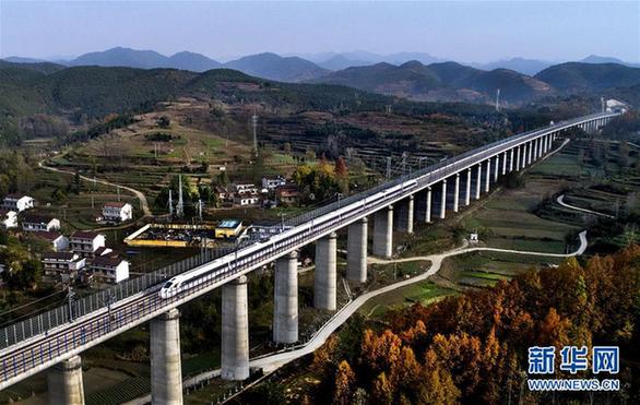 参加模拟运行的55251次CRH3A型动车组列车通过秦岭任家山高架桥(11月22日摄)。