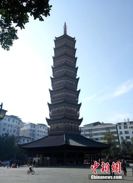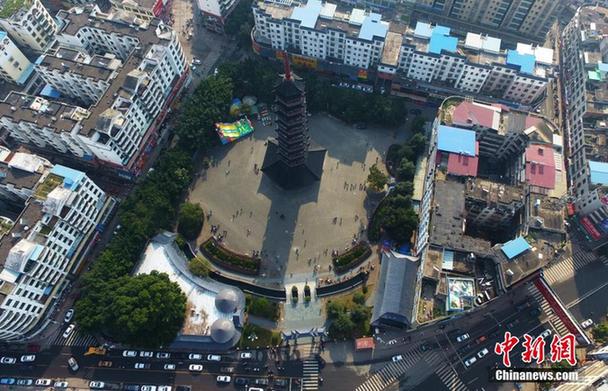 12月10日,航拍位于江西赣州市信丰县县城的北宋“江南第一高塔”——大圣寺塔,造型雄伟,结构严谨。信丰大圣寺塔建于北宋治平元年(公元1064年),为平面六角形九级楼阁式砖塔,大圣寺塔九层十八级,塔高66.45米,史称“凌霄绝顶,通省无以伦比”,为长江以南现存最高宋塔,堪称“江南第一塔”。