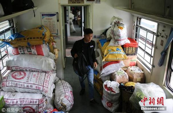 穿行在四川凉山喜德县境内的慢火车。该线路列车往返于四川攀枝花和越西县普雄镇之间,全程353 公里,历时9至10余小时,共停靠26站。该车在途径地处乌蒙山连片特困区的凉山州喜德、越西县时,几乎每隔10分钟就停靠一站。因此成为沿线贫困山区群众经商购物、求学就医、走亲访友的便民车。图为一位乘客走过堆满货物的大件行李车车厢。