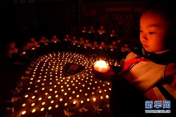 12月12日,邯郸市邯山区实验小学学生点燃蜡烛,为南京大屠杀遇难同胞默哀。