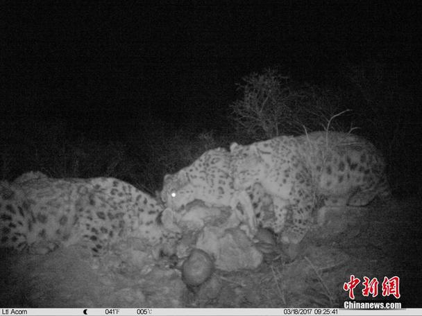 红外相机记录罕见一幕 雪豹幼崽与母亲分食牦牛