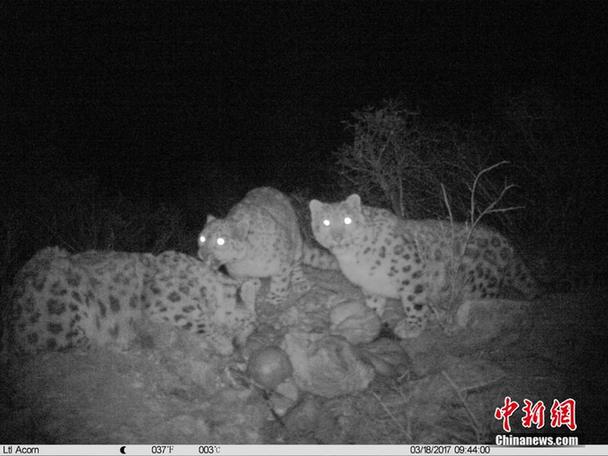 红外相机记录罕见一幕 雪豹幼崽与母亲分食牦牛