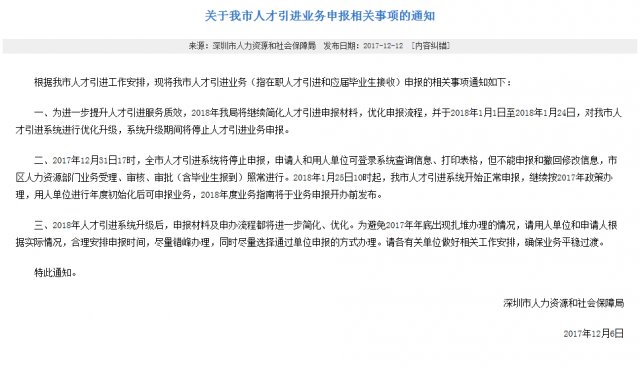 深圳新闻网讯 2017年12月13日,深圳市人社局发布通知称,因人才引进系统优化升级,2017年12月31日17时,全市人才引进系统将停止申报,2018年1月25日10时起,新系统开始正常申报。