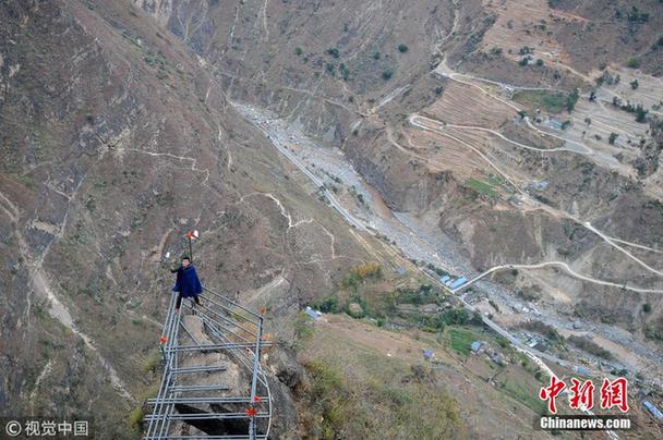 他每天都在悬崖村的钢梯上进行2-3个小时的网络直播。杨阳一边介绍家乡的风光,一边还跟网友粉丝们打趣。现在他已经拥有3.5万的粉丝,俨然成了村里的“明星”。