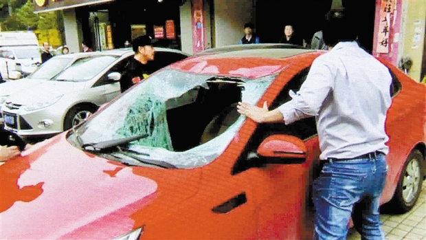 15日下午,市民余女士正在龙华区荔苑大厦A栋一楼店铺忙活,突然听见一声巨响。余女士跑到外面一看,被眼前的一幕给惊呆了。一名男子躺在一辆红色小车内,车前挡风玻璃被砸烂。从周围邻居口中得知,该名男子是从高层坠落下来的。