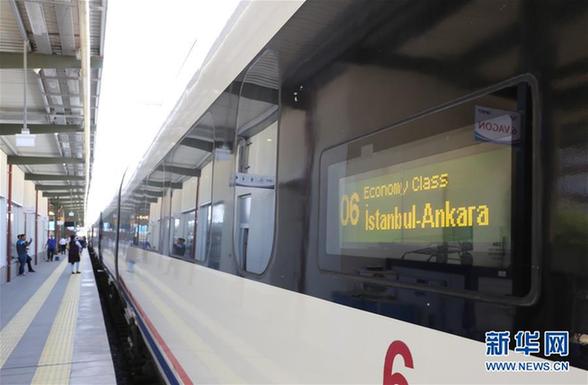 这是2017年4月30日在土耳其伊斯坦布尔彭迪克火车站拍摄的开往安卡拉的高铁列车。由中国企业参与建设的连接土耳其首都安卡拉和土最大城市伊斯坦布尔的高速铁路二期工程2014年7月底顺利通车,使安卡拉和伊斯坦布尔两个城市间铁路运行时间由9小时缩短至3个半小时。