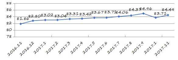 与10月对比,11月交通文明四项分项指数均呈不同程度上升的现象。其中,守法率指数为83.99分,比上月增加0.90分。原因是部分监测点交通管理人员积极维持交通秩序,行人闯红灯、非机动车闯红灯、载客、占道逆行等违规现象有所减少,行人、非机动车守法率为74.74%,比10月上升1.19个百分点。市民感受度指数为75.00分,比10月增加0.22分,接近"比较满意"水平。主要原因是部分监测点过往市民对交通文明满意度评价上升,选择"很满意"和"比较满意"的市民占64.13%,比10月上升1.16个百分点。交通设施完善指数为92.96分,比上月增加0.24分。主要原因是部分监测点交通标志缺失、交通标线不清晰和信号灯故障现象减少。其中,出现交通标志缺少现象的路口比10月减少10处。人行道无障碍指数为88.98分,比10月增加1.02分。主要原因是部分监测点堆物、违章设摊和机动车乱停放现象减少。