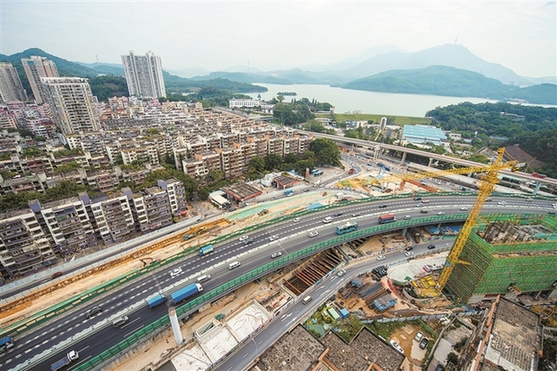 深圳新闻网讯 东湖立交是我市重大建设项目,计划于2018年完工。建成后丹平快速路和布心路、东环快速路将形成立体互通,这一片区存在已久的交通拥堵问题有望得到解决。据悉,东湖立交建设内容包括A、B、C、D四条匝道,其中D匝道已于近日投入使用,其余匝道的建设也快速推进,部分匝道的桥墩已经立起。(深圳特区报记者 刘羽洁 摄)