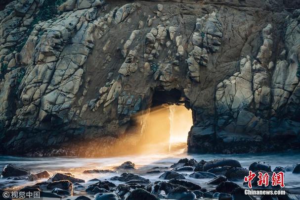 美加州菲佛海滩现美国版“金光穿洞”奇观