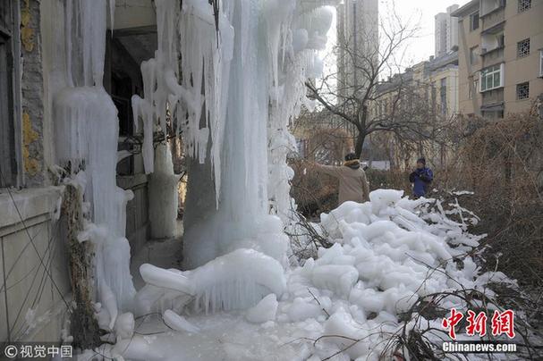 自来水管漏水 辽宁一楼房外形成4层楼高“冰瀑”