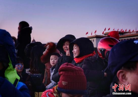 2018年1月1日,随着晨曦的第一缕阳光照耀在天安门广场,五星红旗冉冉升起。数万民众现场观看了2018年的第一场升国旗仪式。
