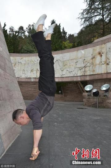 袁廷均练习“一指禅”源于儿子的一场疾病,他抱着孩子在医院排队挂号等了很久,既焦急又无计可施,当时他就想,如果能通过武术强身健体,少生病,就不用到医院“受罪”了。儿子病情好转后,他便买来一本学习“一指禅”的武术书,边学习理论,边实践总结,先从俯卧撑等基本功练起,直到2017年年初才真正练成“一指禅”功夫。图为袁廷均在遵义市红军山练功。