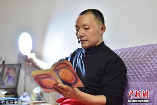 2017年12月29日晚,贵州遵义,袁廷均坐在床头看武术书。他学习一指禅功夫没有老师,全靠书本。