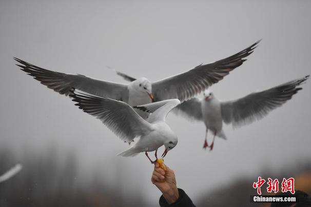 1月3日,一只红嘴鸥站在游客手上吃食。当日,“春城”昆明淅淅沥沥的小雨下个不停,仍有众多游客和市民来到滇池边,与西伯利亚的“白色精灵”——红嘴鸥相会,领略昆明别样美景。