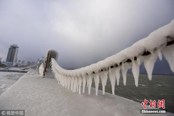 山东烟台遭遇“极冷”天气 海边护栏结冰凌