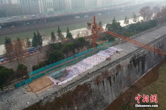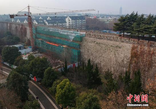 1月17日,航拍南京明城墙武定门南园段,施工脚架已经搭建完毕,工作人员正在维修。近日,南京市对明城墙武定门南园至逸景园小区范围内的部分鼓胀区城墙进行加固维修,“动手术”保健康。