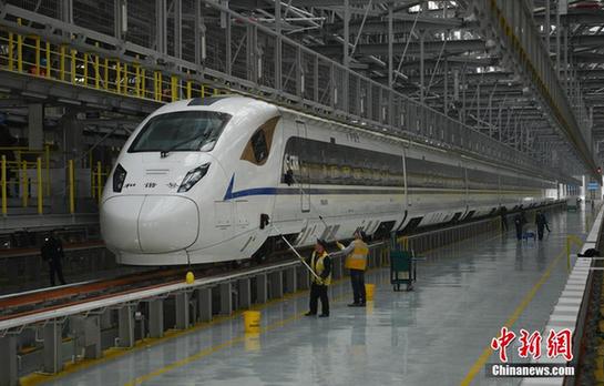 1月17日,清洁人员正在对动车列车进行清洗。当日,成都动车段成都东动车运用所内一片繁忙,技术人员加班加点对列车进行全面检查迎战春运。春运前将有117列动车组陆续接受车内外、车底以及行车数据分析等项目“体检”和“美容”,确保2018年春运列车需求。