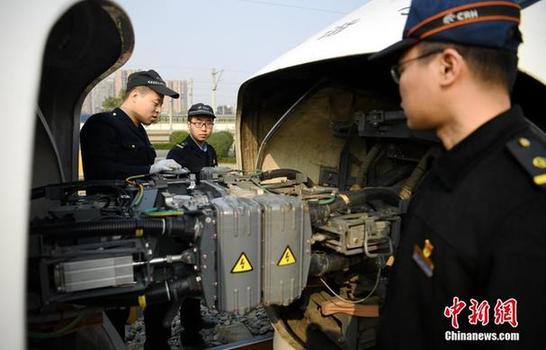 1月17日,技术人员正在对动车列车进行检查。当日,成都动车段成都东动车运用所内一片繁忙,技术人员加班加点对列车进行全面检查迎战春运。春运前将有117列动车组陆续接受车内外、车底以及行车数据分析等项目“体检”和“美容”,确保2018年春运列车需求。
