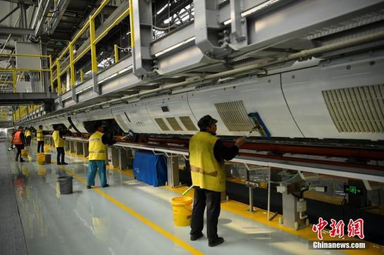1月17日,清洁人员正在对动车列车进行清洗。当日,成都动车段成都东动车运用所内一片繁忙,技术人员加班加点对列车进行全面检查迎战春运。春运前将有117列动车组陆续接受车内外、车底以及行车数据分析等项目“体检”和“美容”,确保2018年春运列车需求。