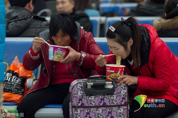 2015年2月24日,长春站,候车室内,旅客吃着各种食物,但是热乎的泡面,任然是大众的选择。