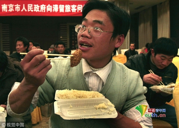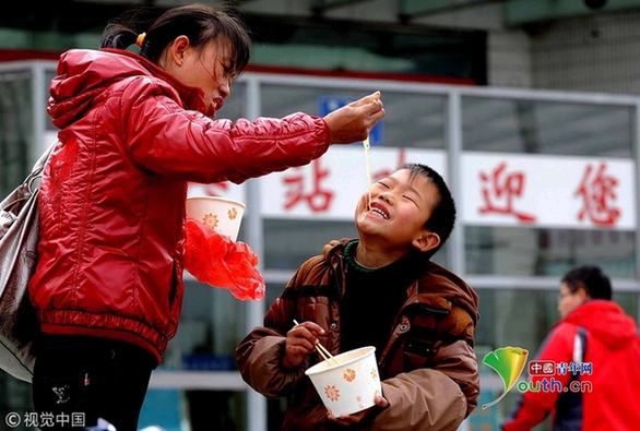 2011年12月29日,浙江嘉兴,火车站广场,临上车前妈妈特意买了两碗面条给儿子吃。