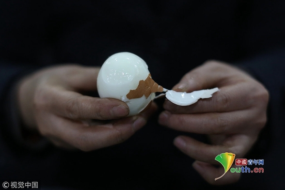 2013年1月27日,北京西站临时候车厅,邓军的妻子剥开煮好的鸡蛋当作晚餐。他们一共带了5个鸡蛋在路上吃。