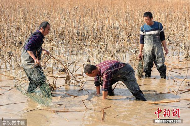 2018年1月19日,山西永济,几名男子正在破冰后的藕池一角摸鱼。进入元月份以来,黄河山西永济段的河水流向陕西一侧,部分在夏天被水淹的滩地藕池开始干涸,当时随水流进藕池的黄河鱼逐渐集中到了一些水洼地带,得知信息的岸边民众纷纷前来破冰摸鱼。