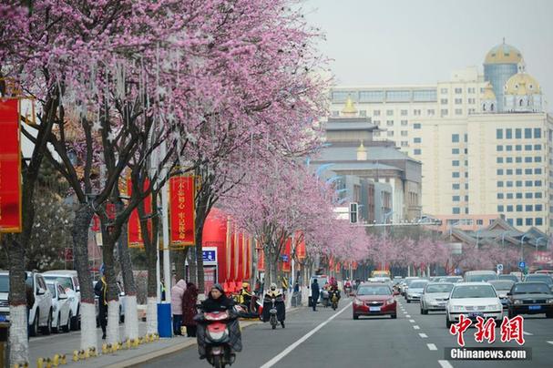 1月21日,汽车路过街边“桃花林”。近日,呼和浩特多条街道两边出现“桃花林”,正常桃花花期一般为3月至6月,而呼市街头开出的桃花均为装饰假花,皆为人工将装饰桃花挂在树上,远远看去,路人似在“桃花林”穿行。