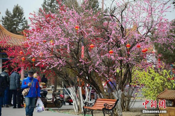 1月21日,民众路过街边“桃花林”。近日,呼和浩特多条街道两边出现“桃花林”,正常桃花花期一般为3月至6月,而呼市街头开出的桃花均为装饰假花,皆为人工将装饰桃花挂在树上,远远看去,路人似在“桃花林”穿行。