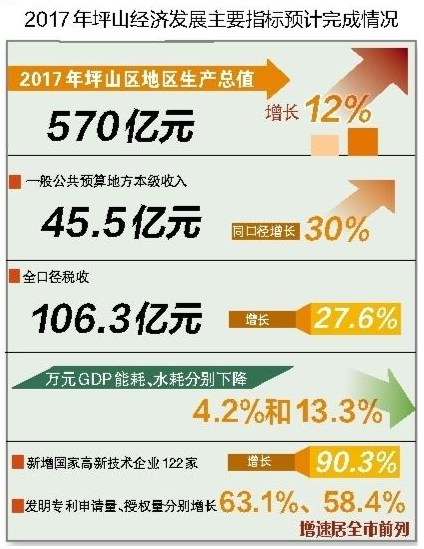 2018年,坪山初步确定经济增长预期目标是:地区生产总值增长10%以上,固定资产投资增长18%以上,一般公共预算地方本级收入增长11%以上。