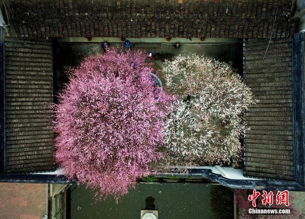 1月25日,位于福州北峰山区的千年古刹林阳寺梅花盛开,吸引许多游客前来赏花游玩。林阳寺是福州五大禅寺之一,相传建于唐朝,距今已有千年历史。图为空中鸟瞰已有200多年历史的红白两株梅花。