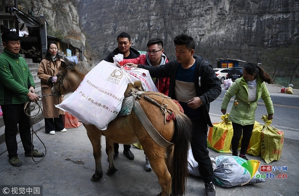 当地商会给古路村90户村民送来御寒、食品等价值2万多元的爱心物资,爱心志愿者和村民正用骡子运上山。