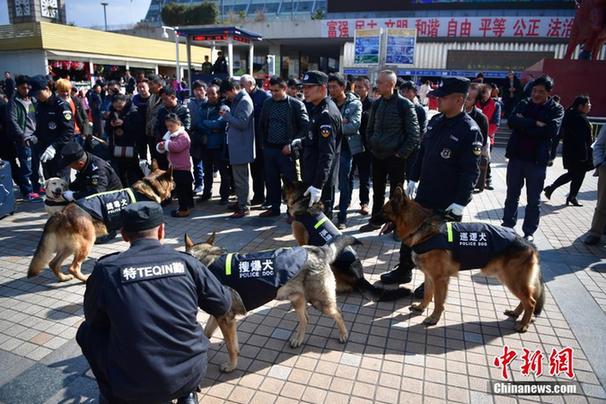 2月8日,警犬和训导员集合准备巡逻。春运期间,昆明铁路警方每天都会派出五只警犬和五位训导员,在火车站进行安保工作。它们和训导员一起从早上七点半就到火车站进行执勤,一直要工作到晚上八点甚至十点,为旅客的出行保驾护航。