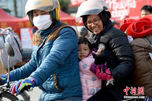 2月8日,广西梧州市东出口春运服务站,一名跟随父母骑摩托车返乡的孩童。梧州市交警支队介绍,自春运以来,过境梧州东出口的返乡摩托车数量已超25000辆。