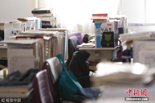 2月25日,太原,在高三年级教室内,书桌上摆放着各类学习资料及励志标语,如同图书馆。当日,山西太原某重点高中举行高考倒计时100天启动备战高考活动,不少家长到教室参观孩子的学习“阵地”为其加油鼓励。